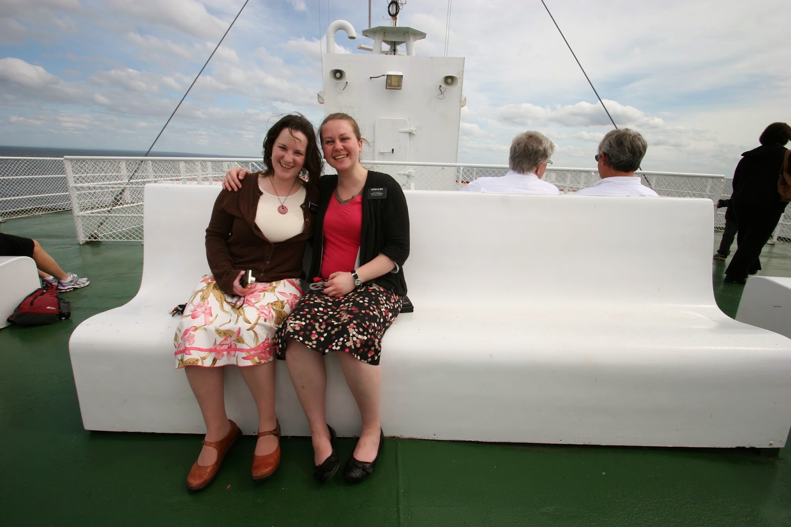 Doch zurück zur Fähre, wir sitzen auf dem Oberdeck und genießen bei warmen, sonnigen Wetter (der Wind war warm wie auf dem Mittelmeer!) die Überfahrt. Es tauchen dann plötzlich viele Menschen auf mit Namenschildern, es ist nicht alles zu erkennen, aber einmal steht der Name darauf und dann groß Jesus Christus. Die Männer sind in schwarzen Anzügen mit Krawatte und die Frauen und Mädchen in Kleidern! Die Ähnlichkeit (Gesicht und Figur) zwischen zahlreichen Mitgliedern der Gruppe ist verblüffend. Plötzlich lösen sich zwei Mädchen aus der Gruppe, setzen sich uns gegenüber auf die Bank und stellen sich vor als Sister Bradley und Sister Olson. Sie waren zwar schon über zwanzig, benommen haben sie sich aber wie Teenager und wir kamen uns vor wie in einem Hollywoodschinken aus den Fünfzigern. Das „oh, my god“, „oh, how exciting“ wollte gar nicht aufhören. Ich fand es amüsant, Irmi nervend. Als geklärt war, dass man heute als Mormone nur eine Frau haben darf und ich ja verheiratet sei, habe ich erklärt, bei meinem Nichtglauben zu bleiben. Eine „Visitenkarte“ mit der Internetadresse der Mormonen musste ich jedoch dann doch mitnehmen.