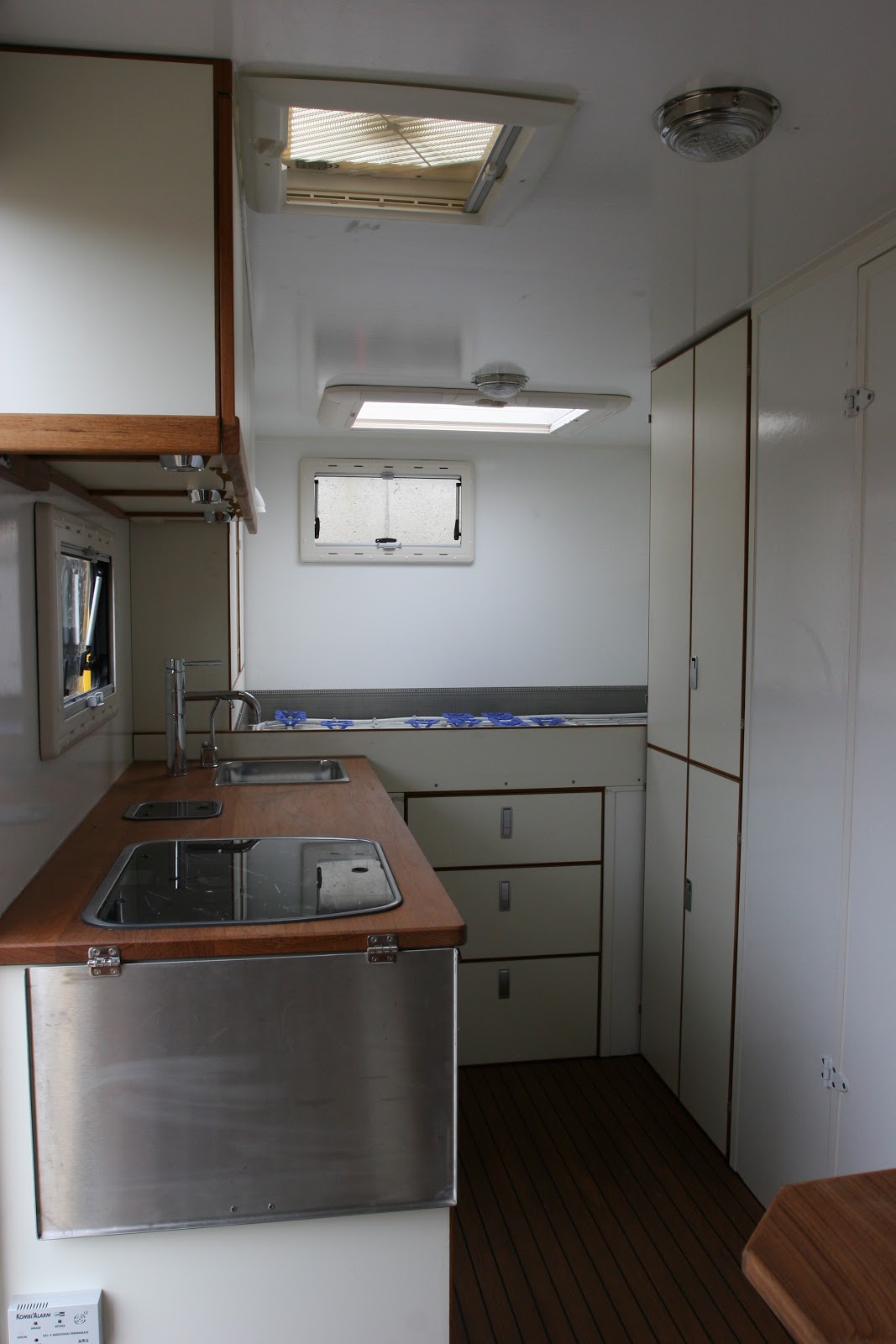 The development consists of a robust formica coated, waterproof glued multiplex panel with edge foil teak, the teak countertops are 3cm in thickness. Hinges and other fittings are stainless steel. Latches on all doors, flaps and drawers.